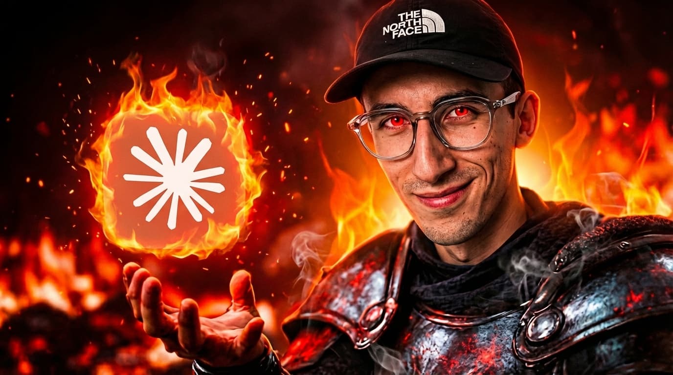 Image Insight: An example generated by Thumbfa.st—Founder Melvyn's face is composited into a flame knight scene holding the product logo. The face maintains high similarity while the scene is entirely AI-generated.